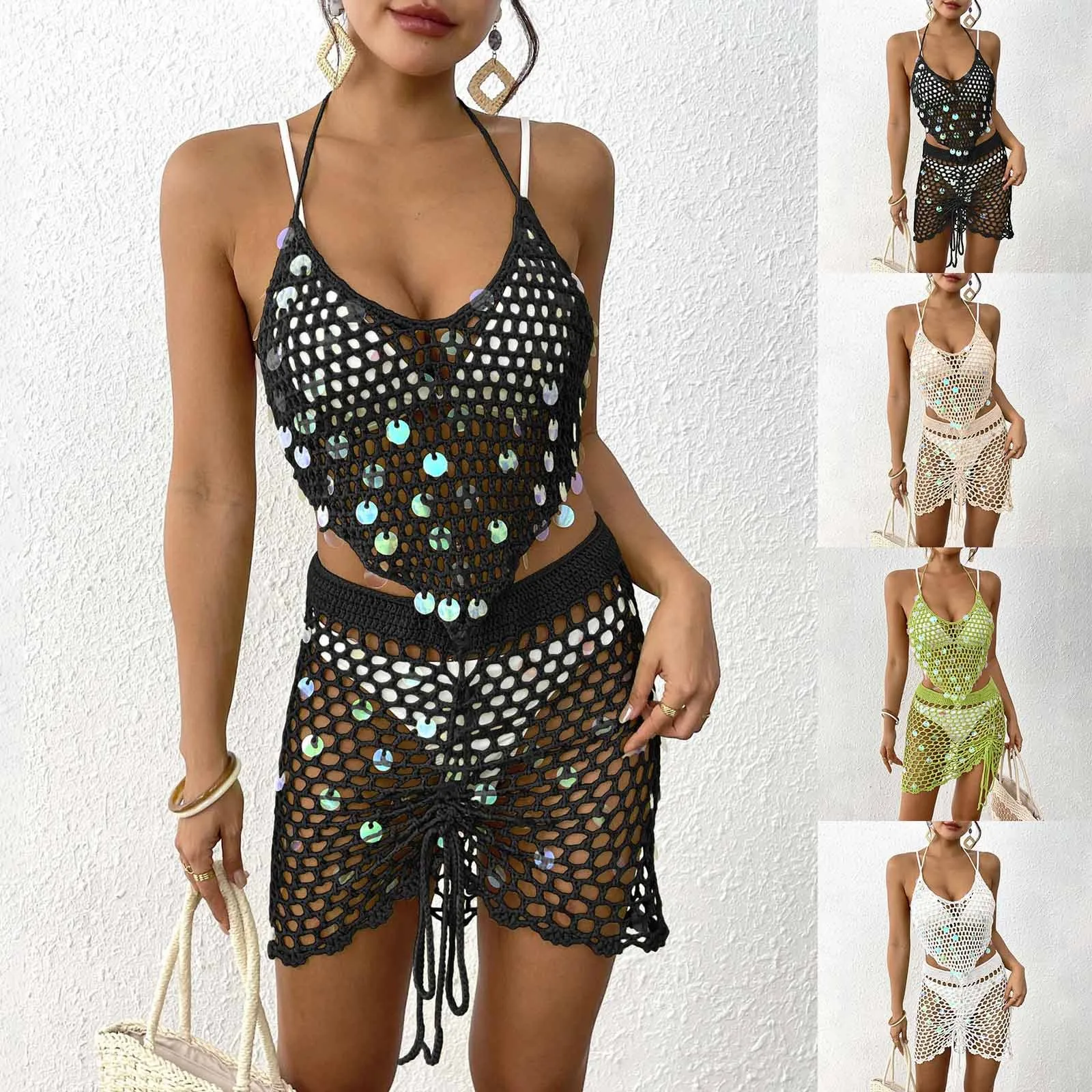 Crochet Bikini Set with Sequin Cover-Up – Women’s Summer Beachwear