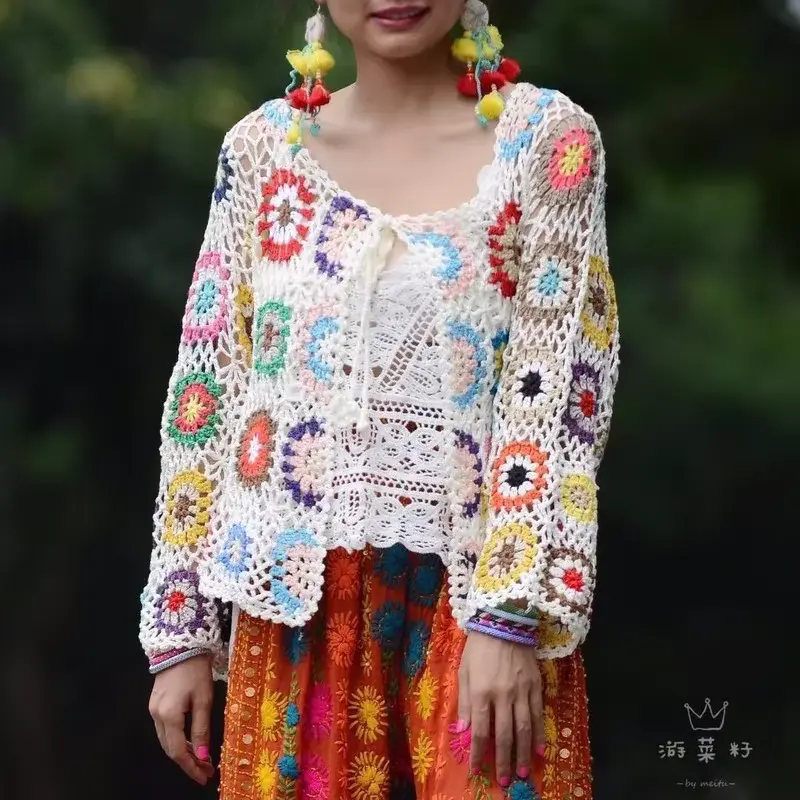 Beautifully crafted using a soft, breathable blend of polyester, cotton, viscose, and spandex, this lightweight knit cardigan is designed with intricate hollow crochet detailing and a relaxed, patchwork style. Its loose fit, slight stretch, and full front opening make it the perfect layering piece for crisp spring mornings or cool autumn evenings.