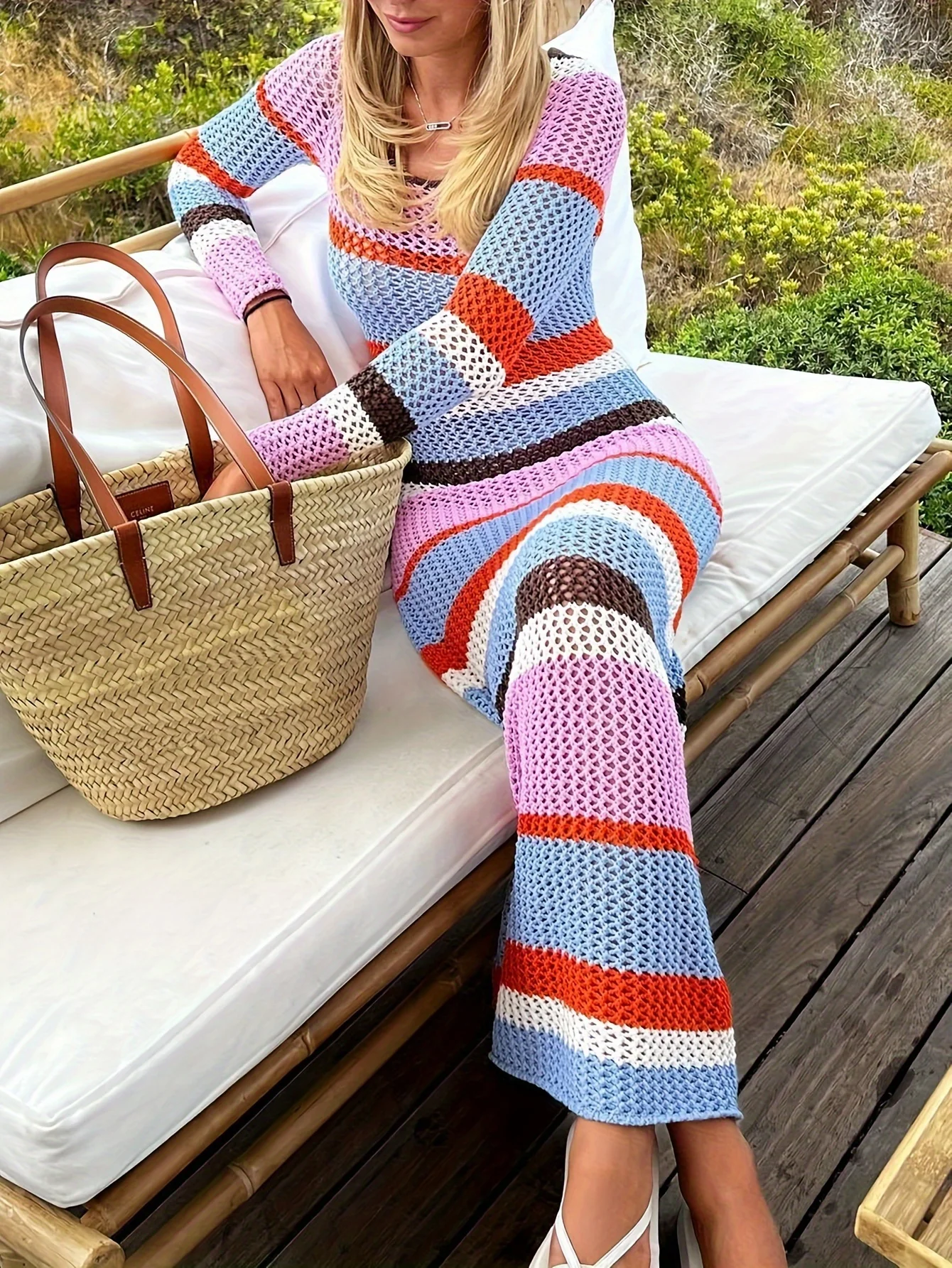 Striped Hollow Out Knit Crochet Maxi Dress for Women – Casual Long Sleeve Holiday Beachwear with Lace Detail